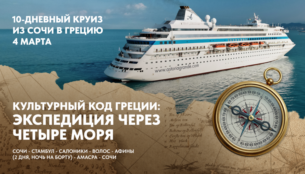 Комфортабельный лайнер Astoria Grande отправляется в круизы из Сочи в уникальные порты Турции, Египта, Греции, Израиля, Италии и Мальты.